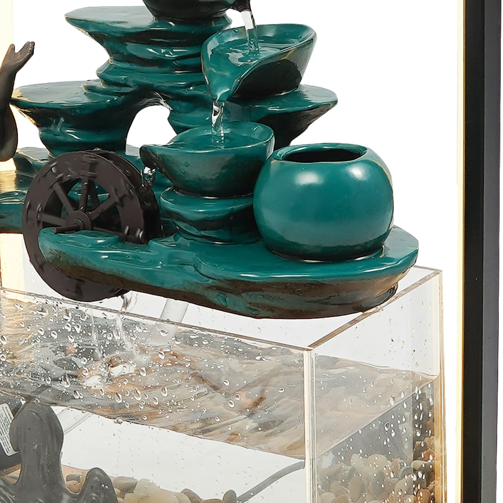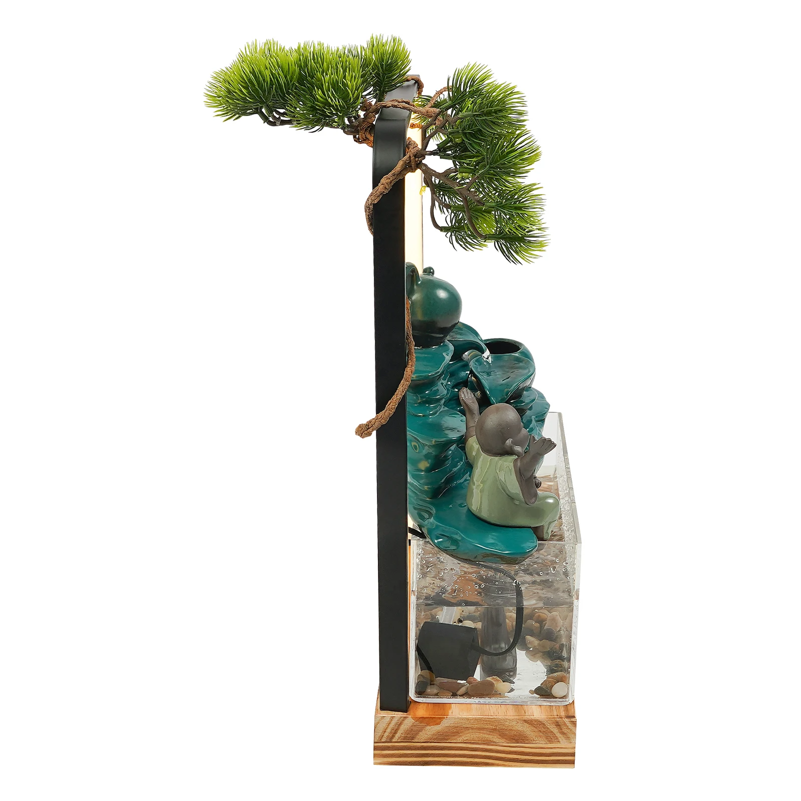 In the busy modern life, we all yearn to create a quiet, peaceful, and vibrant corner of our home. Look at our unique tabletop water fountain. It has a green lifelike greeting pine as its theme, the flowing water slowly flows out of the tea set and into the fish tank below, creating a vivid water feature. It will add a unique charm to your home life, so that you can enjoy the visual and auditory feast, but also harvest full of good luck and wealth. Don't hesitate to take it home!